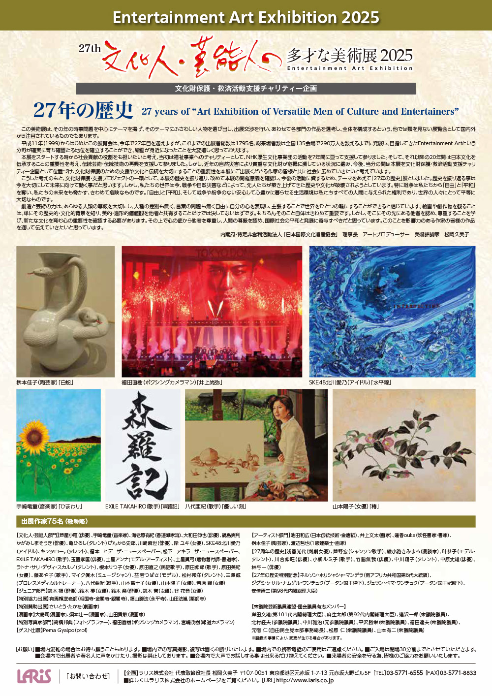 『文化人・芸能人の多才な美術展』とは、幅広い層の方々に多才な作品を鑑賞してもらい、鑑賞者も創作意欲を掻き立て芸術活動に挑戦してもらいたいと考え、一人ひとりの誰もが文化の担い手であることを認識していただく場となることを1つの目標としています。今回の当美術展は、文化財保護・救済活動支援チャリティー企画をスローガンに掲げ、当美術展の27年の歴史の歩みをテーマとし、来場者から寄せられた「もう一度あの作品を見たい」というリクエストに応えるとともに、出展実績のある人気作家の新作などを同時に多数紹介していきます。