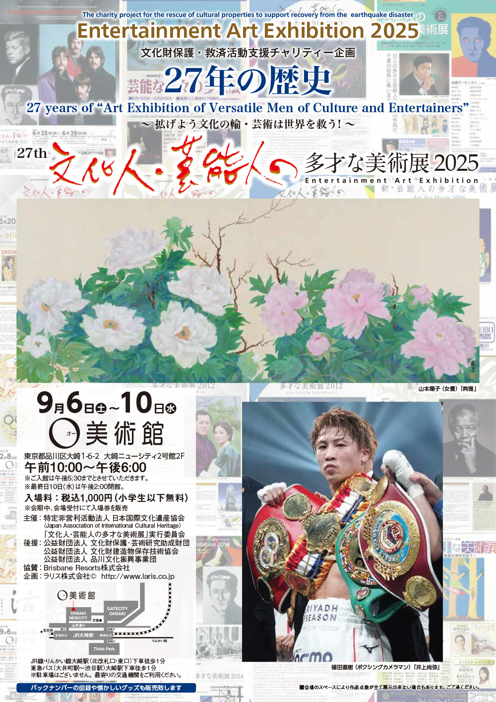 特定非営利活動法人 日本国際文化遺産協会(理事長・松岡久美子)と「文化人・芸能人の多才な美術展」実行委員会(企画:ラリス株式会社)は、2025年9月6日(土)〜9月10日(水)までの5日間、O美術館(※オービジュツカン/東京都品川区大崎1−6−2大崎ニューシティ2号館2階)を会場とし、俳優、ファッションモデル、アイドル、写真家、書家、カメラマン、国会議員、などが出展に協力し、総勢76名125点の美術作品を一堂に集めて公開する27周年『文化人・芸能人の多才な美術展』を開催します。